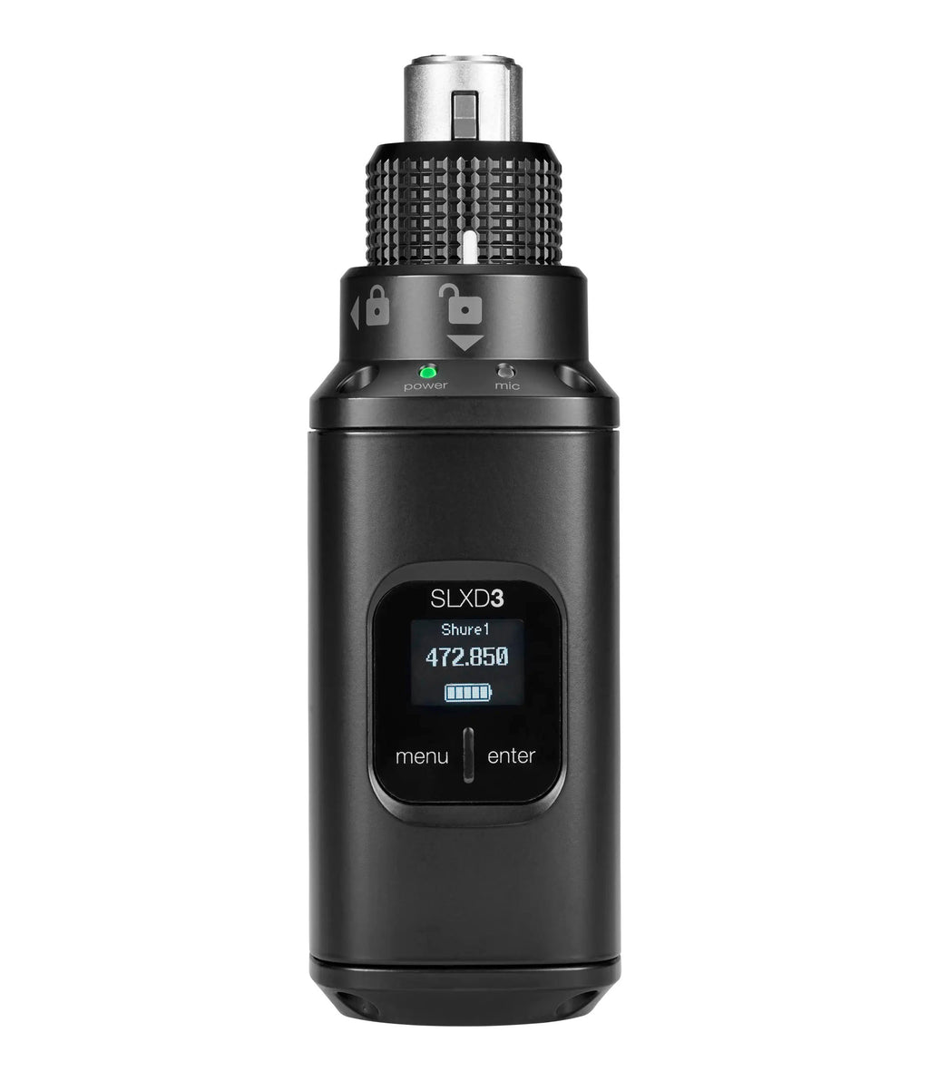 The SLXD3 Plug-On Digital Wireless Transmitter converts any XLR source, including dynamic and condenser microphones, for use as an SLX-D wireless transmitter. Featuring a patented locking ring for a secure, wobble-free connection, the SLXD3 sends 24-bit digital audio from any XLR source to SLXD4 and SLXD5 Digital Wireless receivers via rock-solid RF connection. Use IR Sync to pair transmitters easily and quickly with your choice of SLX-D wireless receiver. A bright front OLED screen displays key system statuses including battery power and transmission frequency.