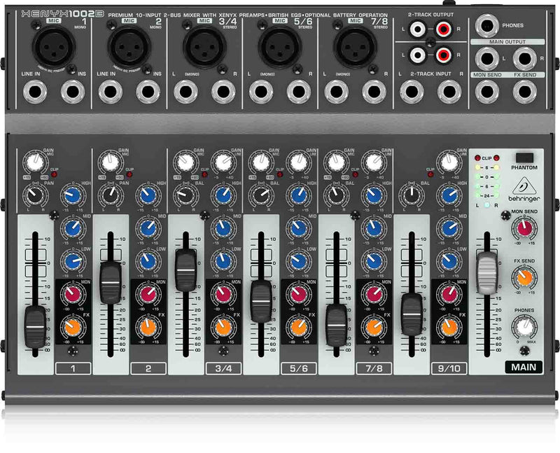 Whether you plug it into the wall or power it via 9V batteries, the XENYX 1002B comes equipped with many of the features you've come to expect from our larger mixers, including XENYX mic preamps for amazing sound quality, phantom power for use with professional-grade condenser mics, 2-Track inputs and outputs, and 60 mm faders. The four stereo channels accept left/right or mono 1/4" TRS/TR inputs, and three of them also accommodate microphones (with separate Trim controls). The compact XENYX 1002B mixer also features our highly musical 3-band British EQ, plus an FX and monitor send for each channel, making it a must-have for any audio toolkit.