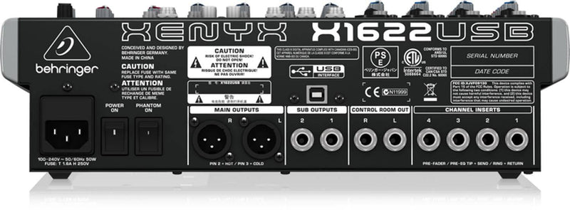 The XENYX X1622USB comes equipped with channel Inserts and our “British” 3-band EQs with the semi-parametric mid band on all mono channels, plus 4-band fixed EQ on the stereo channels. Other features include 2 Aux Sends: 1 pre/post fader switchable for monitoring/FX applications, 1 post fader (for internal FX or external send) – plus Clip LEDs, Mute, Main Mix and Subgroup routing switches, Solo and PFL functions on all channels.