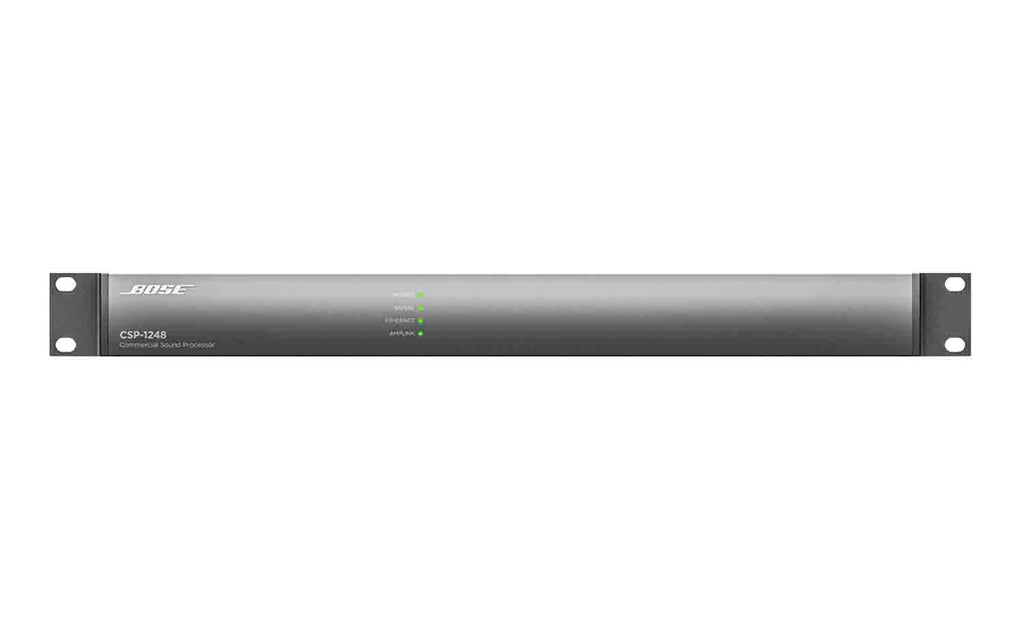 The Bose CSP-1248 is a Commercial Sound Processor with 8 x 4 Balanced Analog I/O. The DSP for quick-turn installations. Bose commercial sound processors are part of a comprehensive platform that includes loudspeakers, controls, and software that help installers deliver premium sound systems efficiently. An onboard CSP configuration utility and intuitive browser-based UI provide a quick-setup workflow. Common tasks are presented in a logical manner, so you can configure the system faster, reducing installation time while increasing setup accuracy. Once installed, Bose-proprietary algorithms offer predictable performance while optional interfaces such as ControlCenter digital zone controllers and the ControlSpace Remote app make operation easy for end-users.