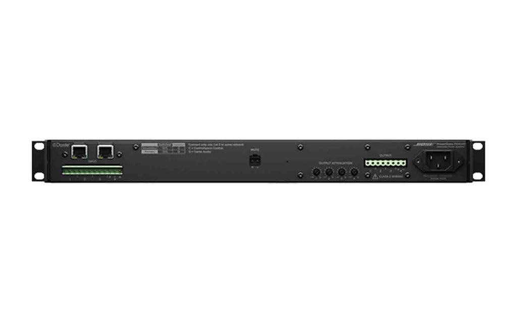 The Bose PS404D is a PowerShare Adaptable Power Amplifier. Put the power where you need it. PowerShare amplifiers deliver outstanding audio performance and reliability with patented technologies inherited from the field-proven PowerMatch line now with added flexibility. Using innovative PowerShare technology, the amp shares power across all output channels and delivers 400 watts for installed applications. This means you can distribute the total 400 watts asymmetrically across all outputs or use any individual output to deliver full power. And with support for both low- and high-impedance loads up to 100V, it’s easy to adapt PowerShare amplifiers to a wide range of applications. ControlSpace Designer software allows for Ethernet-based configuration and quick setup of external control options. With onboard Dante audio networking, you have the flexibility to place PowerShare amplifiers away from source locations and closer to loudspeakers. This unique set of features and technologies makes PowerShare one of the most versatile, high-performance amplifiers available today.