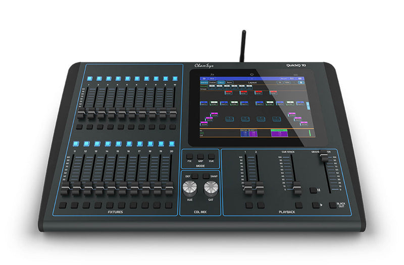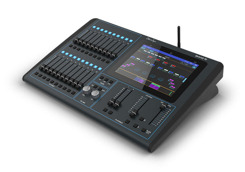 The ChamSys QuickQ 10 Lighting Control Console is part of ChamSys QuickQ range of user friendly and affordable lighting control consoles. The QuickQ 10 is the perfect choice console for control of dimmer and LED color mixing fixtures. The console features a large 9.7-inch touch screen utilizing a smart phone like interface for setup, programming and playback of your show.