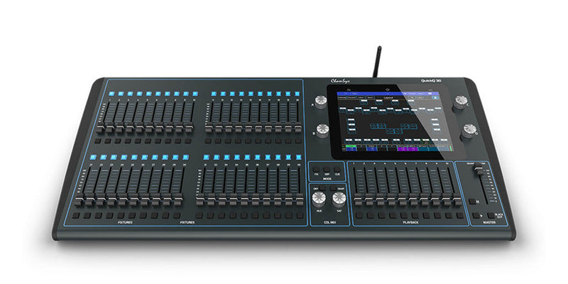The ChamSys QuickQ 30, Lighting Control Console is part of ChamSys QuickQ range of user friendly and affordable lighting control consoles. The QuickQ 30 is the perfect choice console for control of dimmer, LED color mixing and moving light fixtures. The console features a large 9.7-inch touch screen utilizing a smart phone like interface for setup, programming and playback of your show.