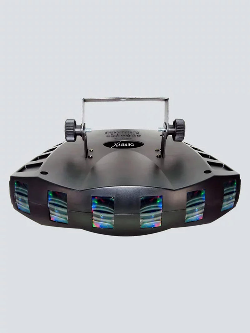 The Derby X is a DMX-512 LED derby effect light, featuring individual control of all 6 LED clusters. Additional features include blackout/static/strobe, built-in automated and sound activated programs, and linkable power for up to 27 units.
