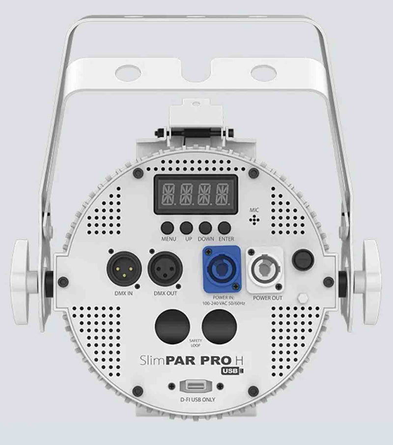 The Chauvet DJ SlimPAR PRO H USB is a Low-Profile LED Effect Wash Light White designed for any application that calls for a high-power, low-profile LED washlight with precise colors. Features include D-Fi USB compatibility for wireless control. SlimPAR Pro H USB has no moving parts and is flicker-free so it is ideal for quiet and on-camera applications. Generate a broad spectrum of colors and achieve natural-looking color temperatures with 6-in-1 LED technology. Fits best in the CHS-30 VIP Gear Bag. White housing not available in European Markets.
