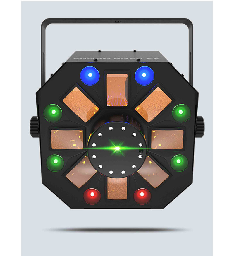 The Chauvet DJ Swarm Wash FX is a 4-in-1 LED effect fixture that combines an RGBAW rotating derby, RGB+UV wash, red-green laser, and a ring of white SMD strobes. Create an endless array of looks by individually controlling each effect via DMX and master-slave modes. Other features include automated and sound-activated programs and a user-friendly menu structure. Multiple units can be power linked to save time running cables and extension cords. Fits best in the CHS-40 VIP Gear Bag.