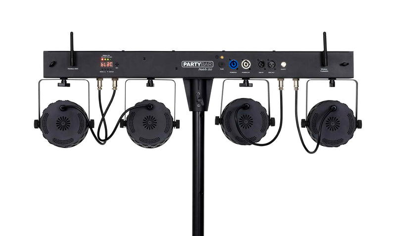 Experience true versatility with the PartyBar Mobile 150's multifaceted control options. Dive into intricate lighting sequences with wireless DMX signal control. Standalone programs create intricate lighting sequences effortlessly. Synchronize with music using the Sound Active mode or let it run autonomously with Auto and Master-Slave modes. An included IR remote and optional Footswitch give you instant control alternatives at the push of a button.