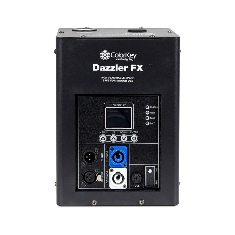 The ColorKey Dazzler FX is a safe and impressive cold-spark fountain system. Set your events apart with a dazzling geyser of shimmering sparks that can reach up to 15ft and pre-heat in as little as 3 minutes. Create intense displays of light when activating with the included wireless controller or connected through DMX 512. The Dazzler FX wireless remote allows you control of timing, height, volume, and frequency as well as offer push button access to numerous multi-Dazzler FX programs!