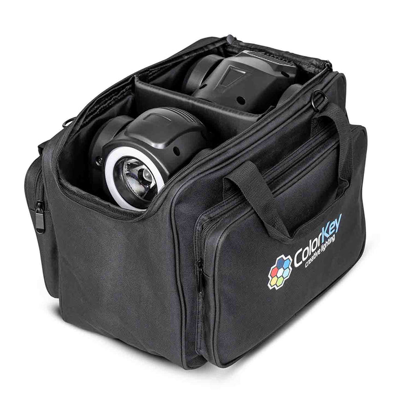 The Colorkey CKU-9040 2pc Mini Moving Head Bag is a compact and practical solution to carry two mini moving head lights, such as the Mover Halo spot, Mover Halo Beam QUAD MKII, Miniwash Quad 4 MKII, and Mover Wash HEX 12, or one larger moving head such as the Mover Spot 150.
