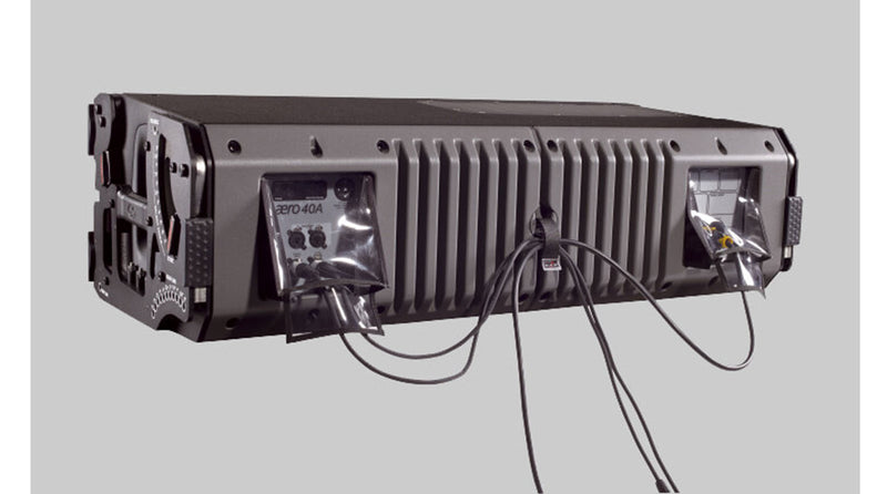 The AERO-40A has been constructed using birch plywood and finished with the ISO-flex black paint it offers excellent protection and durability. Three individual assemblies comprising the high frequency waveguide, the horn device for the 8” mid-range and the carrier for the 12” woofer is made from injection molded aluminum and attached to the front of the cabinet. A two-piece injected aluminum heat sink housing the amplifier and related electronics is attached to the rear of the cabinet. To provide both strength and resistance to corrosion, stainless steel has been used for the fasteners and major parts of the new rigging system.