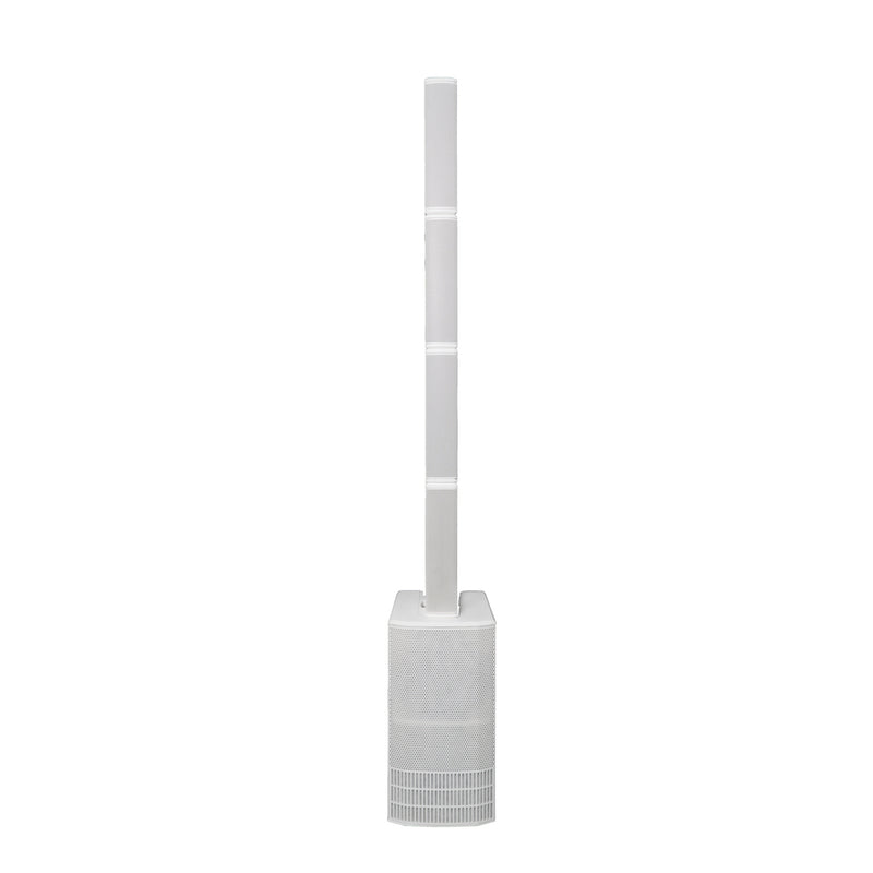 The dB Technologies ES 1203 WHITE is a 3-amped stereo sound system composed by 2 passive wooden tops and one active wooden subwoofer equipped with 2X12” woofers. The sub hosts last-generation Digipro G4 2400W Peak amp. A powerful DSP (controlled by an intuitive user interface placed on the top of the sub) manages all function of the 5-channel on-board digital mixer as well as the system configuration. Each top satellite is equipped with 4x4” mid-woofers, whose alignment allows an asymmetrical vertical coverage (thanks to the Logarithmic Curved Column Array technology). The unique design of phase plugs widens the horizontal coverage and guarantees a perfect intelligibility. Moreover, on board DSP allows users to choose among 3 Configuration Modes (Mono, Stereo or Double Column) and 2 different Steering Modes (Far and Near). This way, the system adapts to all kind of environments and guarantees the best throw pattern. Top satellites work separately in a stereo configuration(placed on tripods or installed with WB-44 accessory) or connected together in mono configuration. The enclosure of both satellites embeds a metal lock system assuring perfect top to top matching and electrical connection. One of the two satellites receives the signal from the sub and relaunch it to the companion top. ES1203 features an on board 5-channel mixer: the first channel features a MIC/instrument balanced/unbalanced combo connector with an adjustable anti-feedback filter, impedance compensation and microphone gain with 3 positions (0, +10, + 20dB). The second and third channels are MIC/LINE inputs with balanced/unbalanced combo connector. This allows the system to manage up to 3 mic lines at a time.