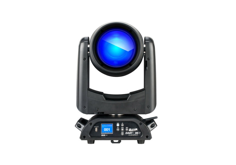 The Elation DARTZ 360 Compact RGB Beam Moving Head with 360 Pan/Tilt is a precision-engineered beam luminaire designed for maximum versatility and high-impact performance. Featuring a patent-pending 50W RGB LED engine with a sharp 3° aperture and motorized focus, it delivers brilliant output and smooth color mixing with no minimum safe distance required making it ideal for a wide range of professional lighting applications. Its continuous 360° pan and tilt with 16-bit precision offers unmatched dynamic movement, complemented by an array of built-in effects including 14 static-stamped gobos, dual independent rotating prisms, a linear frost filter for wash effects, and variable dimming curves. With full protocol support (DMX, RDM, Art-NET, Kling-Net, sACN), internal E-FLY wireless DMX, and flicker-free operation, the DARTZ 360 is optimized for live events, TV, and film.