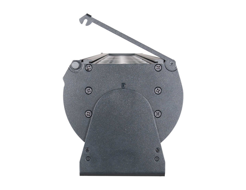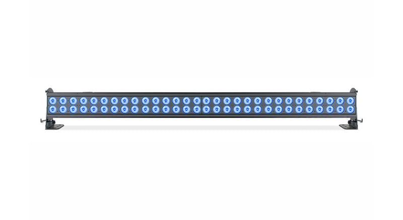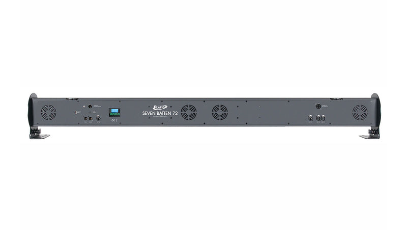 The Elation Seven Batten 72, 60 x 25-Watt RGBAWL+UV LED Batten Fixture is a seven color 6-foot (1.8m) long batten wash luminaire with (60) 25W 7-in-1 RGBAW + Lime + UV (395nm) LEDs. Features include individual hue, saturation, and intensity control, special RGB SEVEN 3 channel mode (RGB + dynamic white, amber, lime, and UV), 10 pixel mapping zones with pixel flip mode, smooth color mixing, 12 internal programs with speed and fade control, 64 unique 7-color macros, selectable dimming curve modes, adjustable LED refresh rate and gamma brightness for flicker free operation for TV and FILM, DMX Art-Net, Kling-Net, and RDM (Remote Device Management) protocol support, 3/5pin DMX, RJ45 ethernet, and Locking Power Cable in/out connections, dual 220° manual tilt adjustable mounting brackets, OLED menu display with a 4-button control panel, a multi-voltage universal auto switching power supply (100-240v), a rugged powder coated die-cast aluminum exterior, and an integrated gel / frost filter slot.