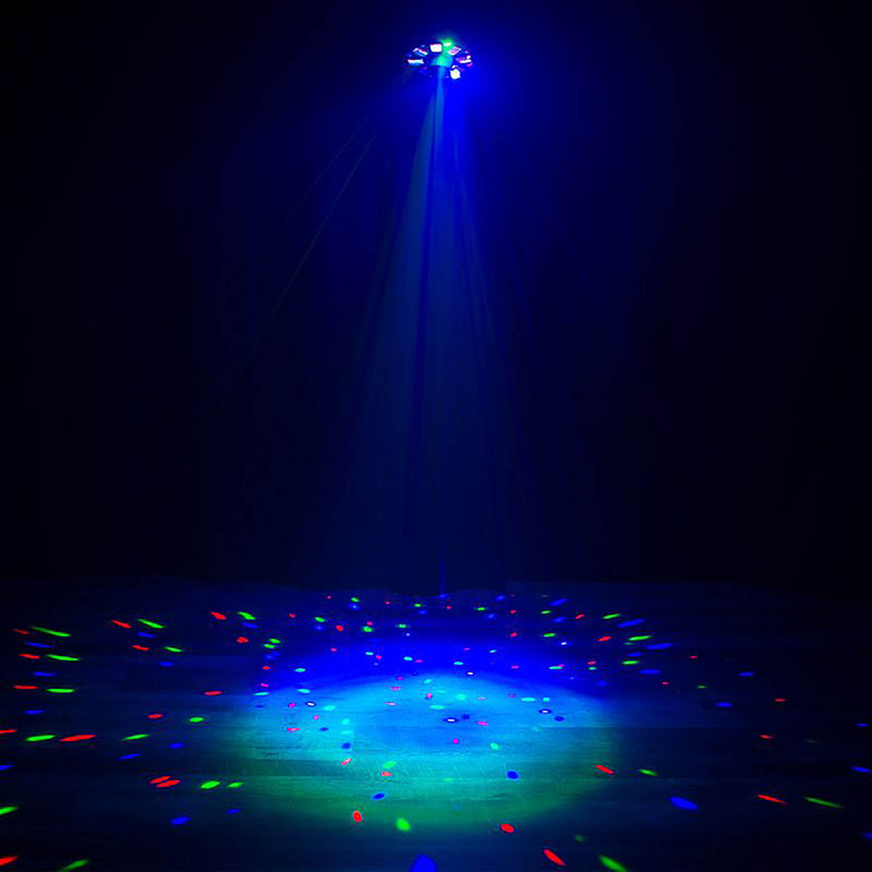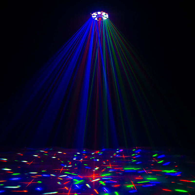 The Moonflower effects, powered by the penta-LEDs, fill a room with quick-moving multi-colored light. Plus, washes of color fill a dance floor from the quad-LED illuminating the crowd. And finally, razor-sharp red and green laser diode can fill the room with safe laser beams. All this together from the fixtures built-in shows, or from custom DMX programming, create a professional club-style atmosphere, with or without the use of fog.