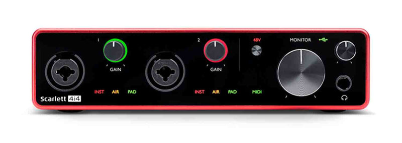 The Focusrite Scarlett 4i4 3rd Gen 4x4 USB Audio/MIDI Interface lets artists and content creators score pro-level tone with no learning curve, no matter where they go. Equally capable for tracking vocals and instruments, the two improved Scarlett microphone preamps feature switchable phantom power for condenser mics, pads to prevent distortion on loud input signals, and a selectable-per-channel Air circuit, which adds clarity-enhancing brightness based on Focusrite's legendary ISA preamplifier.
