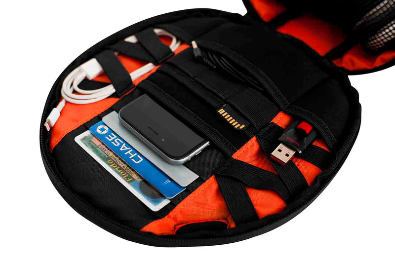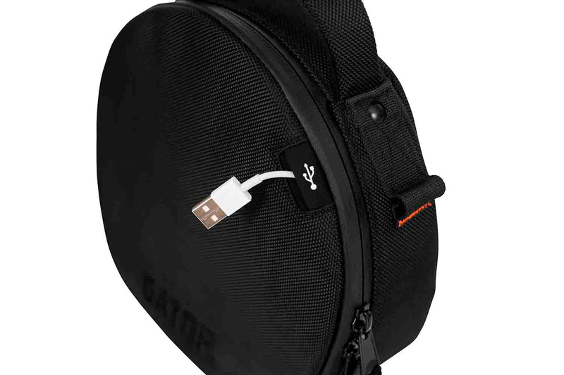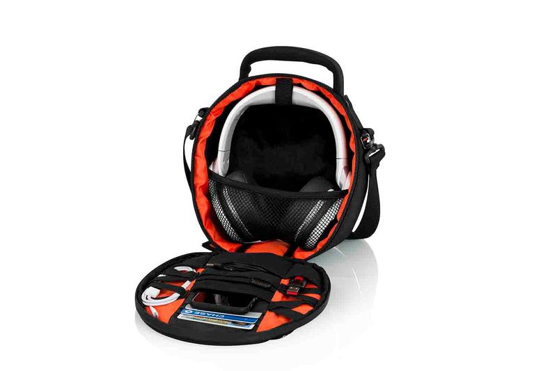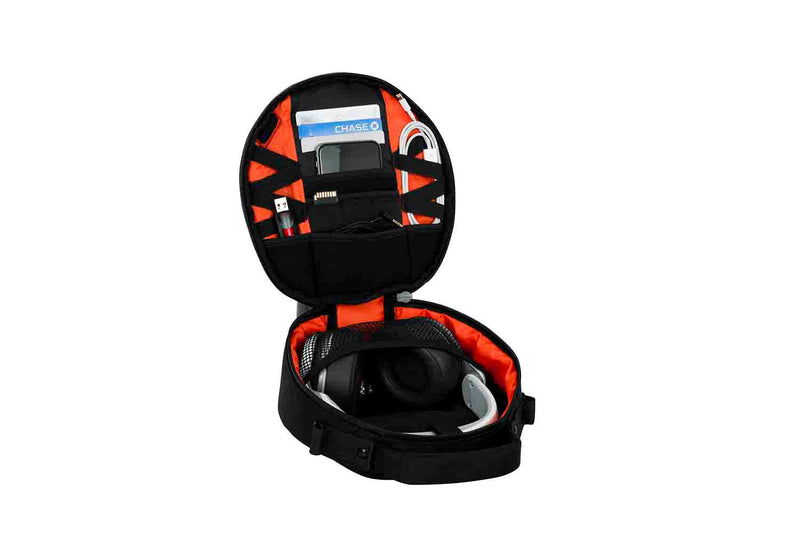 The Gator G-CLUB-HEADPHONE Series Carry Case has Front Panel Storage Compartments for Headphone/USB Cables, Flash Storage, Smart Phone, ID Cards and More. USB Grommet on Front of Bag for Running Power Cables to Devices Inside. Adjustable Removable Shoulder Strap and Reinforced Padded Carry Handle. Bright Orange Liner for Better Visibility in Dark Clubs or Rooms. Velvet Lined, Padded Compartment with Hook and Loop and Elastic Mesh to Secure Headphones. Compact Heavy-duty Nylon Carry Bag for DJ Style Headphones. All Black Exterior with Orange Accents.