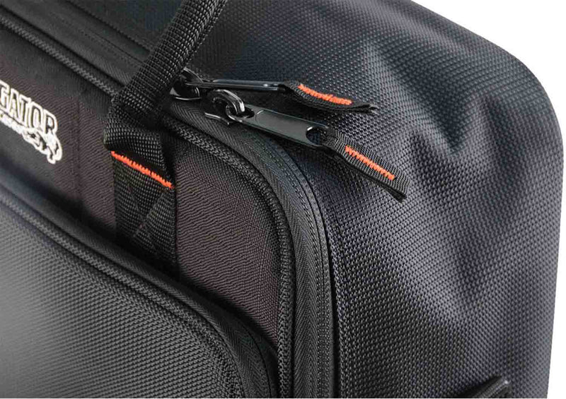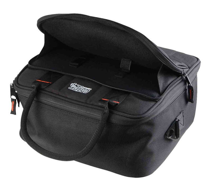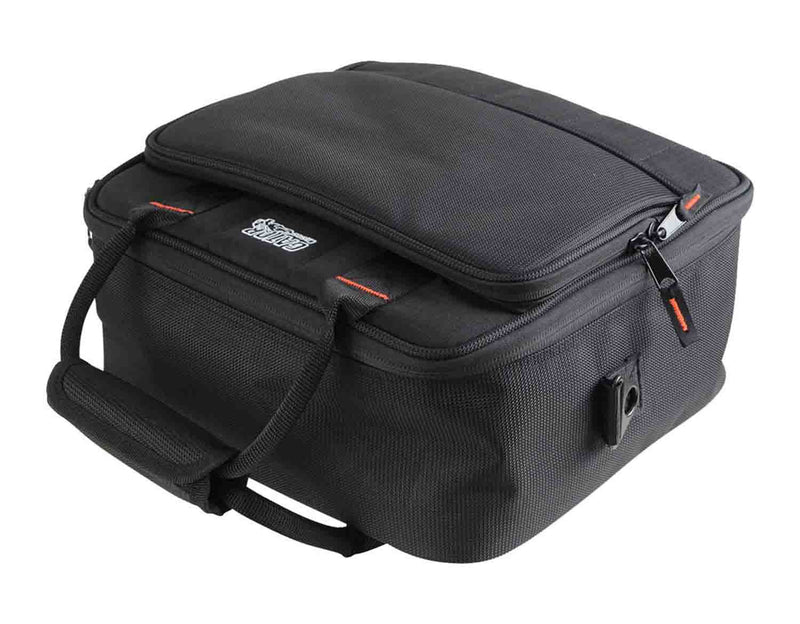 The Gator Cases G-MIXERBAG-1212 is a Updated Padded Nylon DJ Bag for Mixer and DJ Equipment - 12″ X 12″ X 5.5″. The Rugged Nylon Exterior 10mm Dual Layer Padded Protection Protective Tricot lined interior Removable shoulder strap & comfortable webbed handles External storage pockets with cord management.