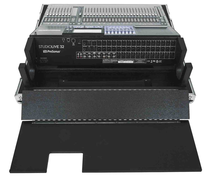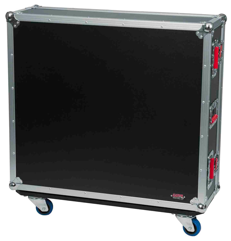 The doghouse features a hinged flip‐down panel allowing you to fold flat for cable routing and multi‐pin snake connections. The caster board, casters signature red recessed twist latches, and spring-loaded handles on the G-TOURPRESL32III make transporting your large format mixer a breeze.