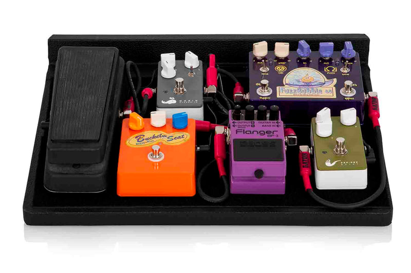 The Gator Case GPT-BLACK Is Plywood Pedal Board Covered in Tolex. Pedal Board Comes with Carry Handle Which Slides into a Rugged Nylon Padded Carry Case. Pedal board has access holes for cables to run below board to utilize 4 supplied mounting screws for Gator G-BUS and similar size multi-output power supplies. Exterior pocket for cables. Face of pedal board covered with Velcro for attaching pedals - attachment Velcro included.