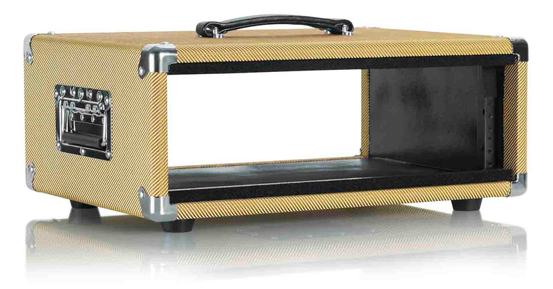 The Gator Case GR-RETRORACK-3TW is a Vintage Amplifier Style Solid Wood Rack Case in Tweed. 3U Rack Space for Guitar Amp Modelers, Effects and Studio Equipment. 12.5" Depth to Accommodate Standard-Sized Rackmount Gear. Cloth-Covered Removable Hook-and-Loop Dust Cover with Oxblood/Gold Stripe Grill. Includes 1U Panel Spacer with Matching Cloth Cover. Kickstand on Bottom to Angle Amp Upwards Towards User Spring-Loaded. Side Handles and Premium Leather Carry Handle for Lifting and Loading. Rubber Feet Allow Unit to Sit Comfortably on Amp, Cabinet or Desk. Rack Screws Included.