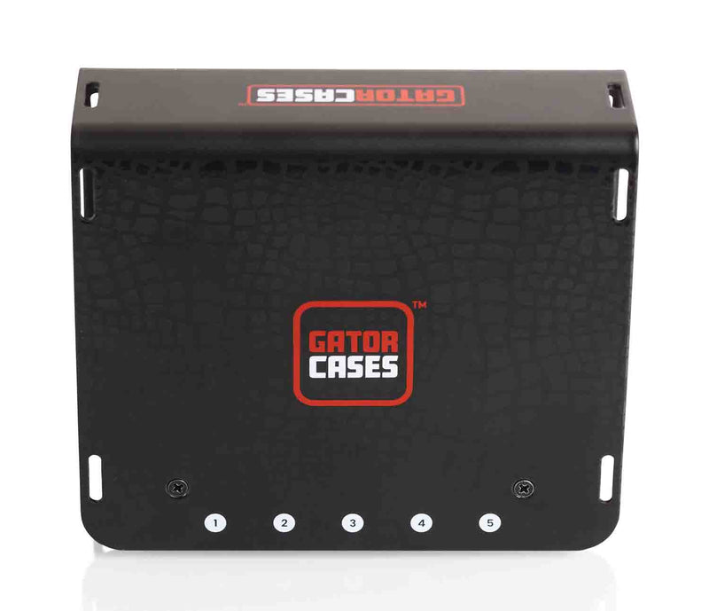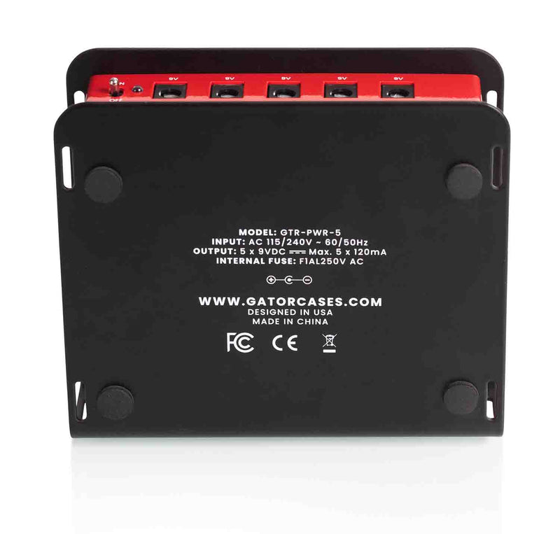 The Gator Case GTR-PWR-5 is Guitar Effects Pedal Power Supply with 5 x 9V DC Isolated Outputs at 120mA Each (600 mA Max Output). Heavy-Duty All Metal Enclosure with Slotted Vents for Heat Dissipation. AC Power Input with Switchable Voltage Between 115/240V (50-60Hz) for International Use. Integrated Slots Allow for Direct Mounting to Pedal Board. On/Off Power Switch with LED Indicator Light. Great for Smaller-Size Boards and Setups. Includes (x1) Power Cable, (x5) DC Power Cables and (x1) Polarity Inverter Cable.