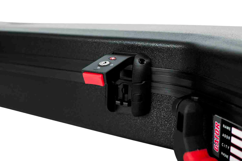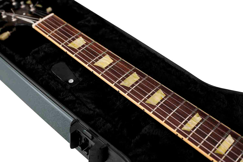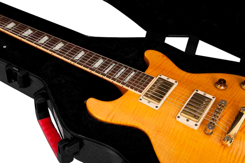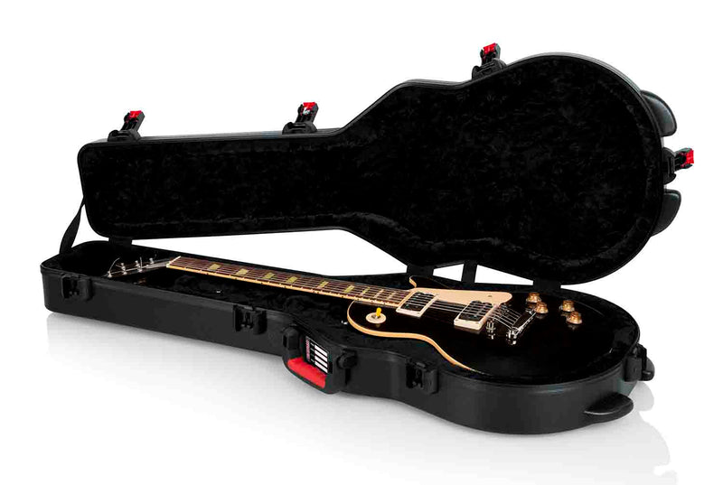 The Gator Case GTSA-GTRLPS is designed to fit Gibson Les Paul and Single Cutaway Electric Guitars. ATA Molded Military Grade Polyethylene Outer-Shell. TSA Accepted Locking Center Latch Ideal for Air Travel. Universal Fit EPS Protective Foam Interior Nest. Thick Black Plush Interior. Extended Reach Protective Neck Cradle. Ergo-grip Injection Molded Handle. Surface Mounted Impact Diversion Latch Housing and Red Release Trigger. Black Powder Coated Hardware and Continuous Valance.
