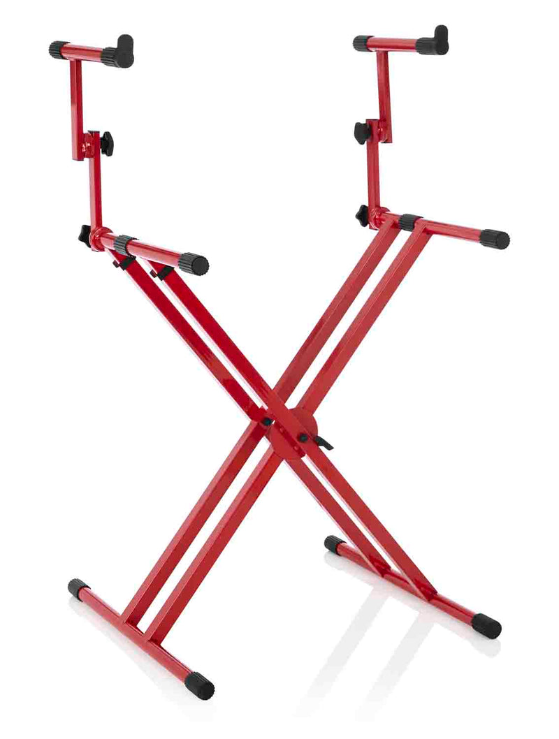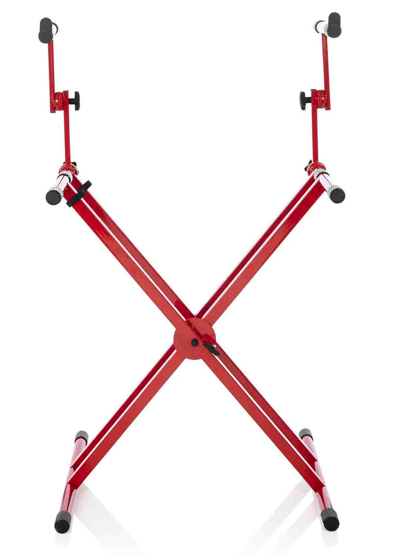 The Gator Frameworks GFW-KEY-5100XRED is a 2 Tier X Style Keyboard Stand Red with Rubberized Leveling Feet.