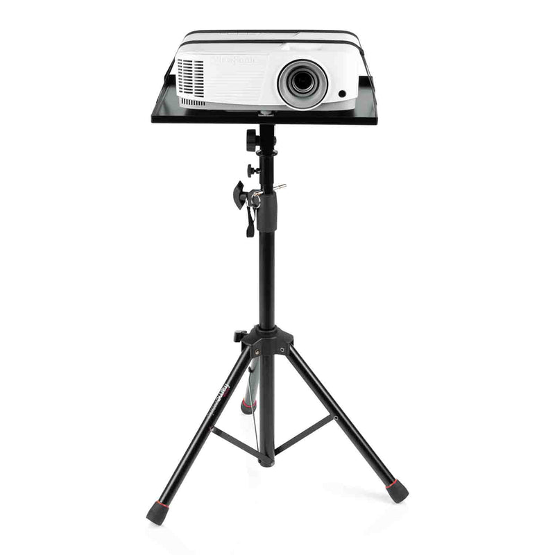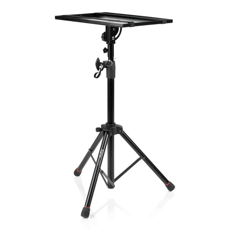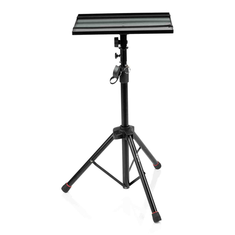 The Gator GFWLAPTOP1500 Laptop and Projector Tripod Stand Sturdy Tray Holds Laptops, Projectors, DJ Gear, Pro Audio Equipment, or Sheet Music. Platform Measures 14”/356mm x 11”/279mm with Adjustable Tilt for Custom Positioning. Optional Elastic Web Straps and Flanged Edges on Tray Prevent Slippage. Adhesive Non-Slip EVA Pad Helps to Grip Gear and Prevents Scratching. Collapsible Tripod Base with Red Removable Safety Trim on Feet. Built-In Safety Pin and Soft-Touch Knob for Securing The DJ Stand at Desired Height. Steel Construction with Black Powder Coated Finish.