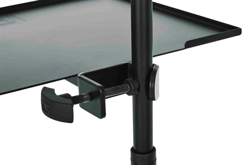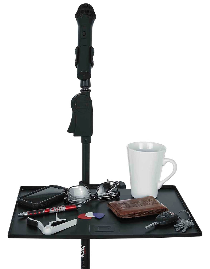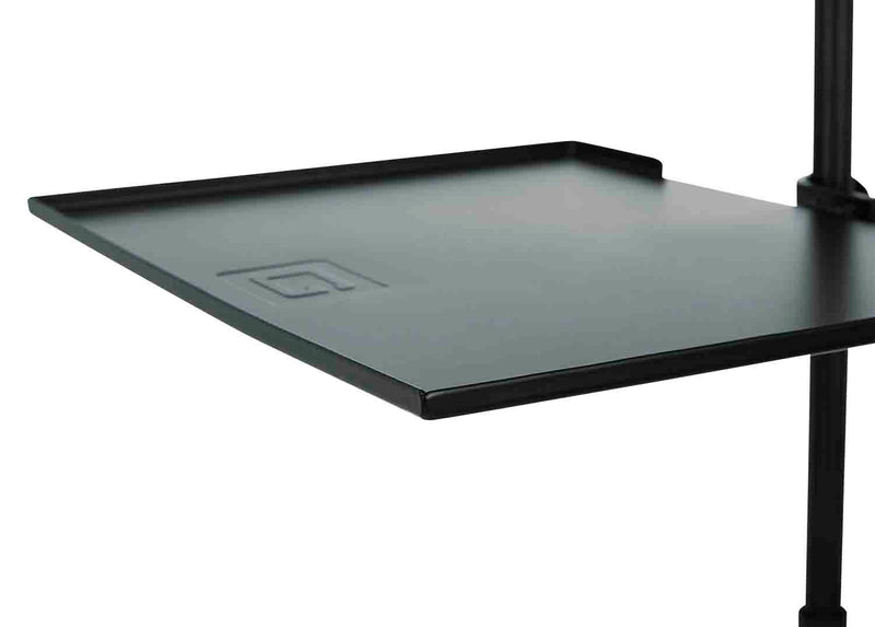 The Gator GFW-SHELF1115 Frameworks 11” x 15” Microphone Stand Accessory Shelf. Have Large Microphone Stand Clamp-On Utility Shelf. Raised Lip Around Edges to Prevent Items from Sliding Off. Great for Holding Medium Size Laptops and Accessories. Steel Construction.