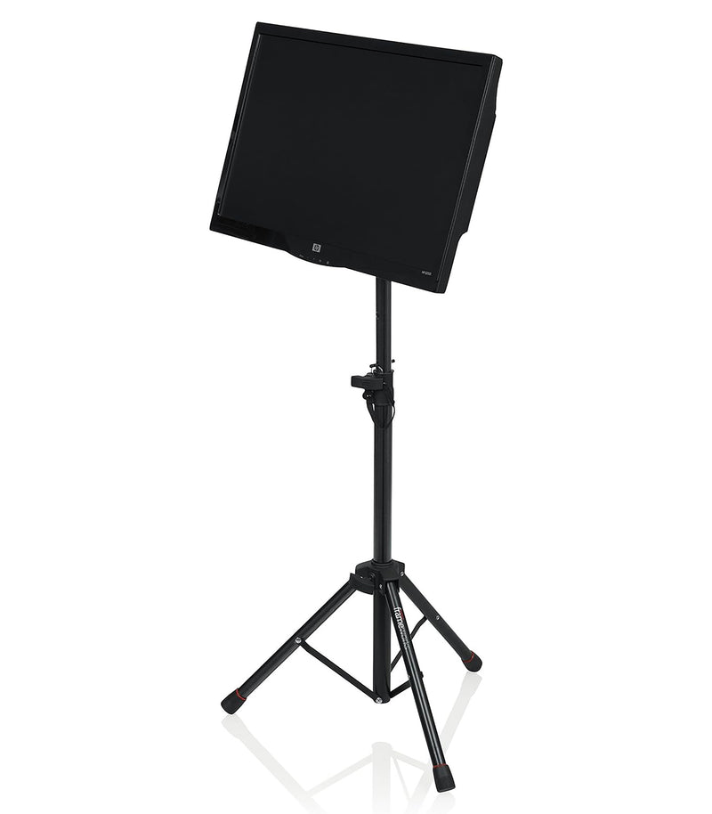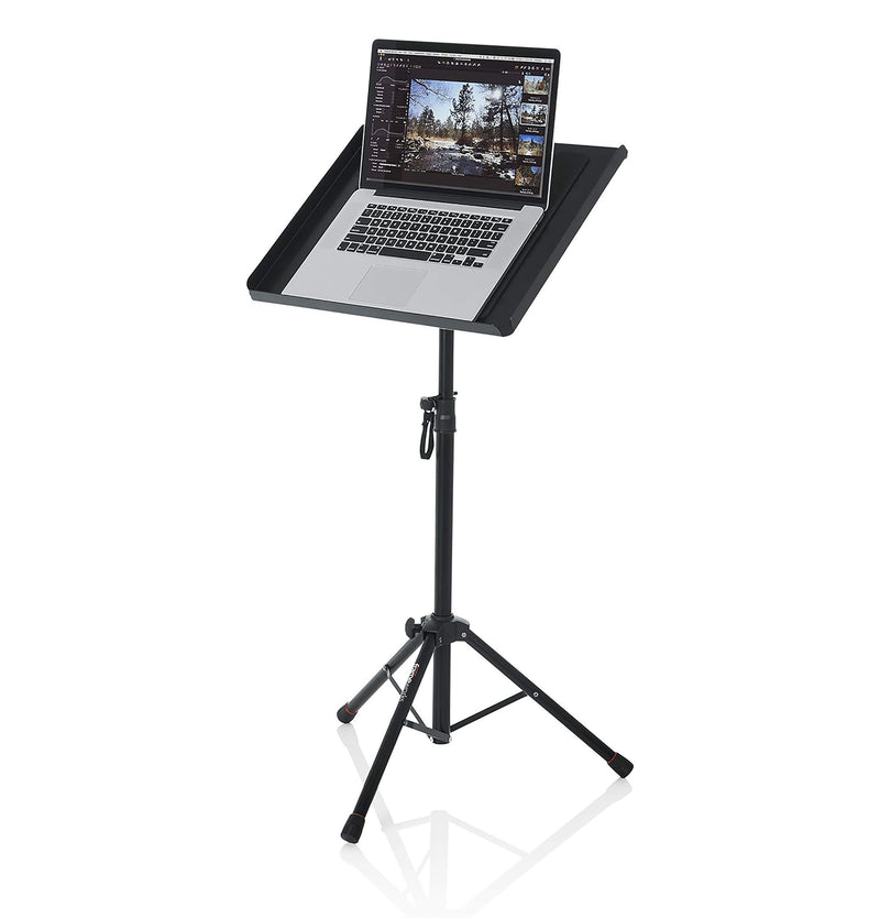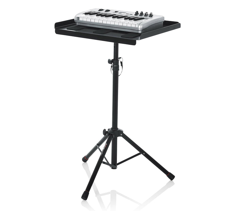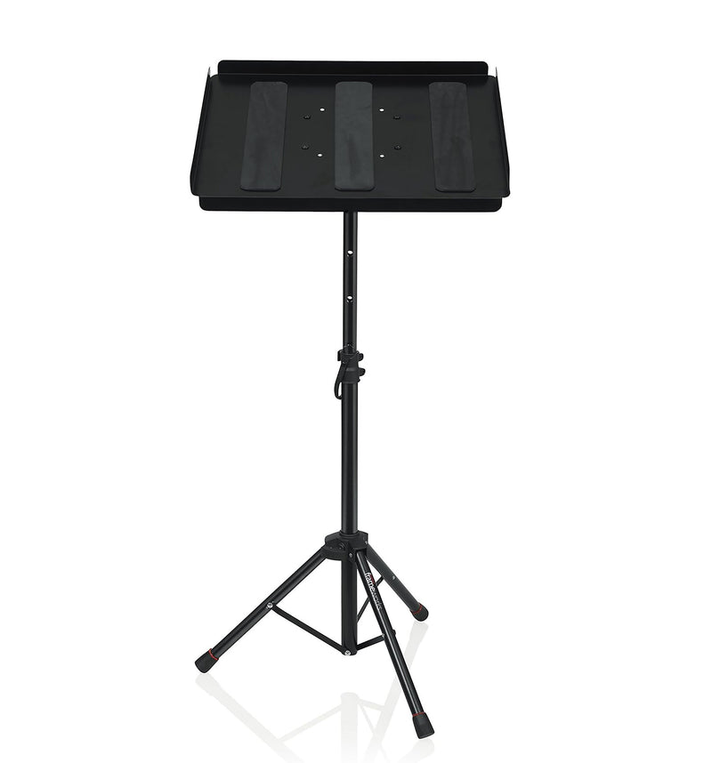 The Gator GFWUTLMEDIATRAY1 Compact Adjustable Media Tray Stand Setup a comfortable workstation or the perfect platform for laptops, projectors, production samplers, sheet music, keyboard controllers and more with the reversible tray. A raised flange on one side lets you securely place items that do not need to be mounted.