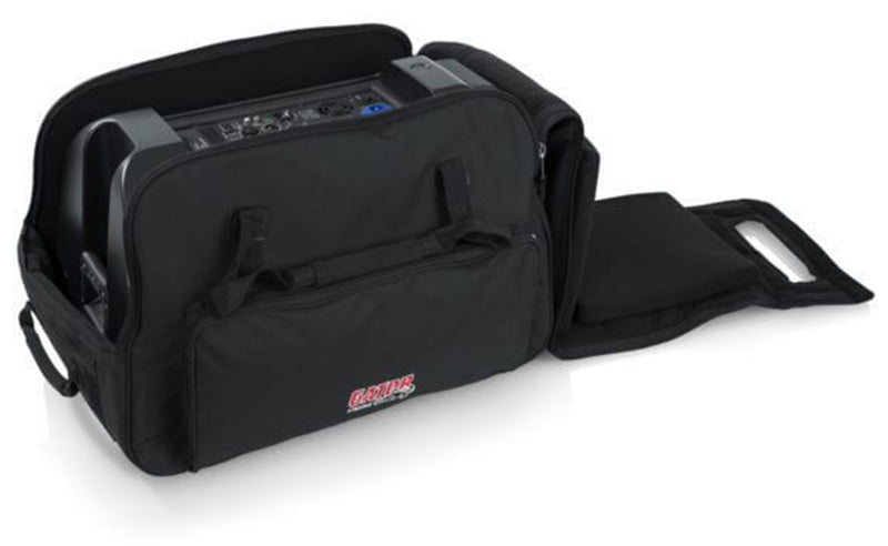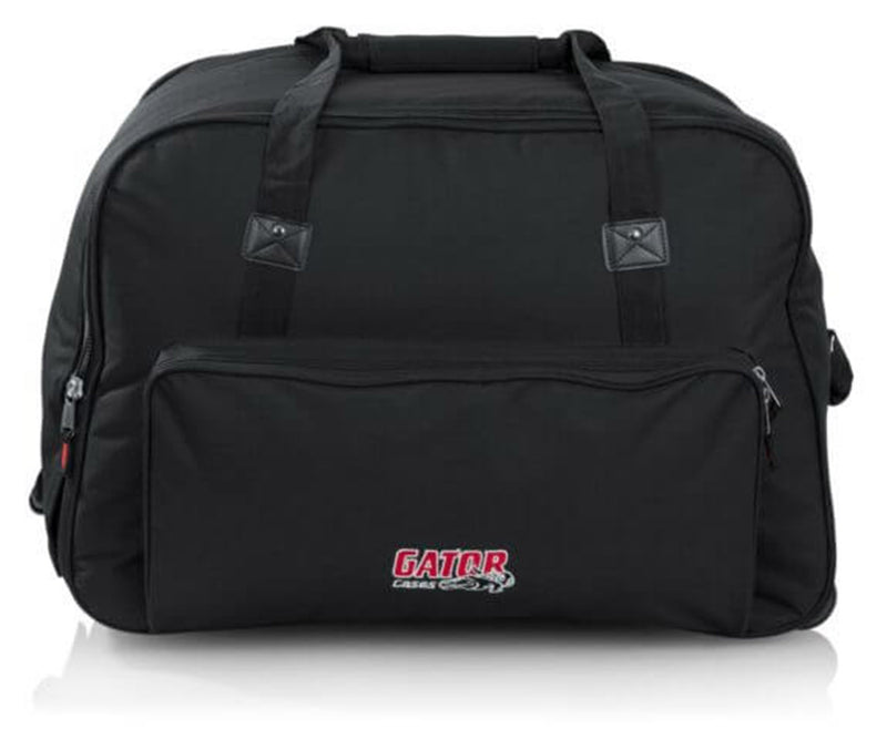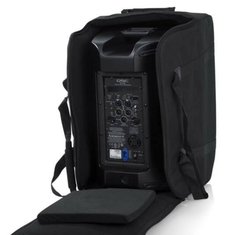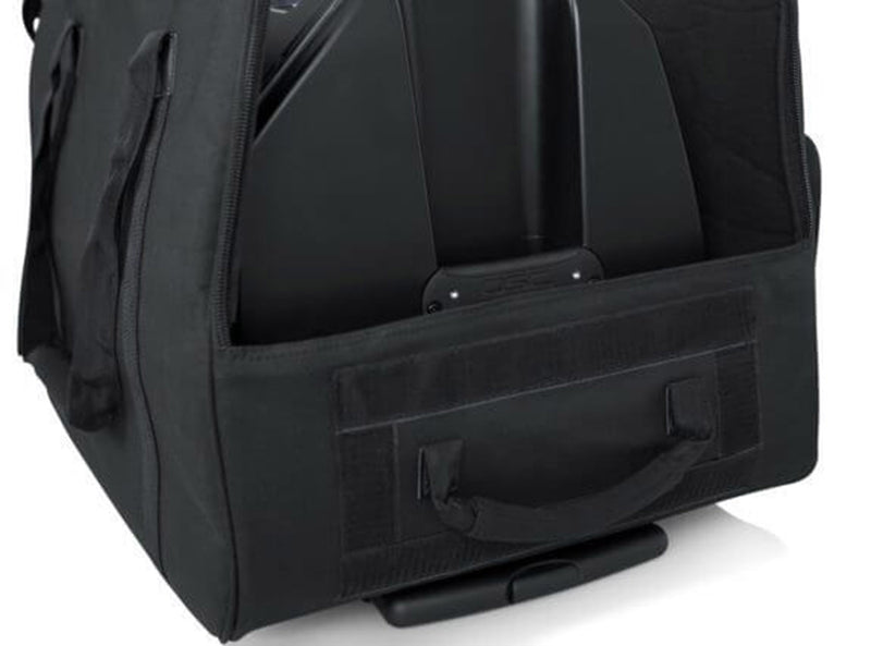 Rolling speaker bag for small format 12″ speakers including QSC K12, Mackie TH-12A, JBL PRX612M, JRX112M, and SRX712M, and Behringer B2120