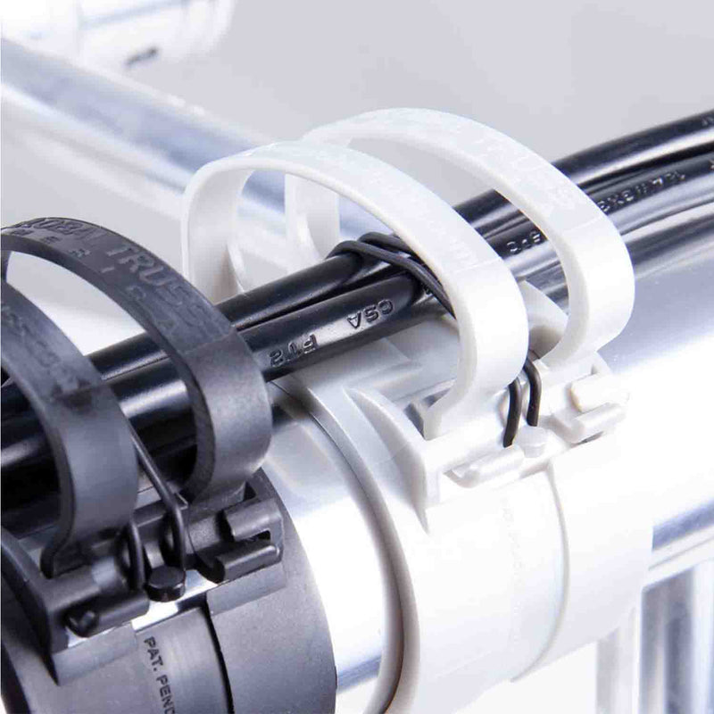 The Global Truss DT-SNAP/LT BLK Cable Management Clip with Rubber Ring 4 Pack - Black attach up to five 12-gauge cables to your truss with a 48 to 50mm outer diameter of black Cable Management Clip with Rubber Ring from Global Truss. Compatible with F31, F32, F33, F34, DT34P, DT44P, DT36, and DT-GP truss, each 4-pack supports cable runs up to 10'. The clips are removable and reusable for use on multiple installations. Each plastic clip snaps onto the truss and comes with an O-ring to hold it closed and secured.
