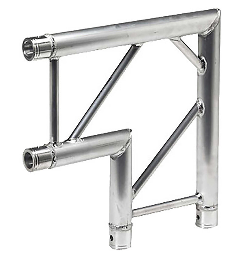 The Global Truss IB-4060-H is a 1.64 ft (0.5 m) 2-way 90 degree horizontal corner junction for the F32 series truss system. It is made of EN-AW 6082 aluminum alloy and is equipped with connecting hardware. The junction is fabricated by certified TUV welders and is TUV SUD approved. It is suitable for light duty applications such as DJ setups, events, and more.