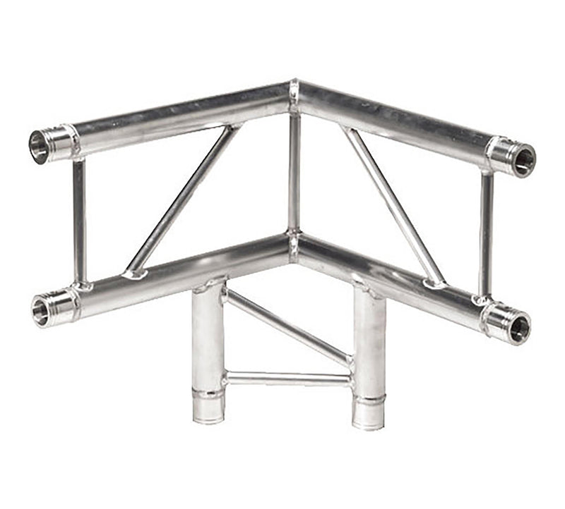 The Global Truss IB-4063-V is a 1.64 ft (0.5 m) 3-way 90 degree vertical corner junction for the F32 series truss system. It is made of aluminum alloy with a thickness of 2mm and has an overall width of 11.41 inches (290mm). The main tubing has an outer diameter of 1.96 inches (50mm) and the diagonal bracing has an outer diameter of 0.78 inches (20mm). The junction comes with connecting hardware and is TUV-certified.