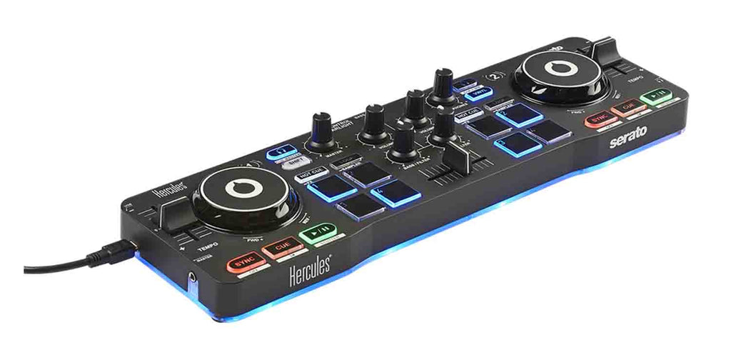 The Hercules DJStarter Kit with Controller, Speakers and Headphones a comprehensive, easy-to-carry and easy-to-install solution including the Hercules DJControl Starlight controller, Hercules DJMonitor 32 speakers, HDP DJ M40.2 headphones and Serato DJ Lite.