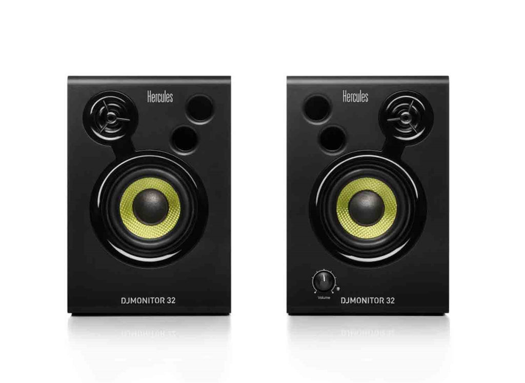 The Hercules DJStarter Kit includes a pair of Hercules DJMonitor 32 active monitor speakers, their compact size makes them easy to use on a desk in a bedroom or as the DJ’s monitor speakers at a party.
