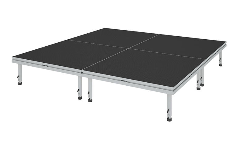 The IntelliStage Subcomponent QLP3I 3ft x 3ft Industrial Finish Stage Panel - Black is a durable, modular platform with a textured black vinyl surface finish. It can be used with QuickLock height-adjustable, telescoping legs (sold separately) from 16"-24" or 24"-32" high or fixed-height legs with casters, 8" or 16" high. The QuickLock mechanism allows for fast, easy setup - simply insert the leg and close the lock switch to secure leg to platform. It can even be set-up on uneven ground. Platforms support up to 153 lbs/square foot (or on casters - 62 lbs/square foot).