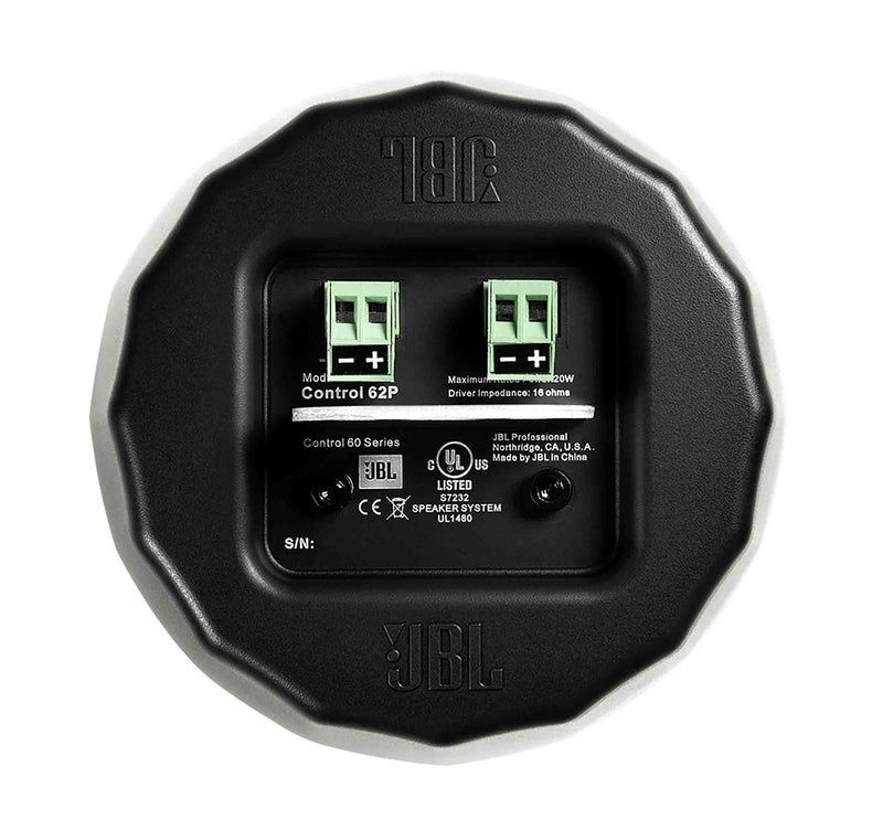 The JBL Control 62P is a pair of ultra-compact satellite pendant speakers ideal for visually-sensitive applications where small speakers are needed. The Control 62P has a 2" driver that delivers high-quality mid/high frequency sounds, perfect for speech or music applications. A full grille protects the driver and gives the speaker a sleek look. The speaker has a 20W power handling capability and a 16 ohm impedance for compatibility with a variety of installation sound systems. You can drive up to 4 Control 62P speakers from a Control 50S/T or 40CS/T subwoofer for wide-bandwidth performance. You can also intermix the Control 62P with Control 52 and 42C surface and in-ceiling speakers.