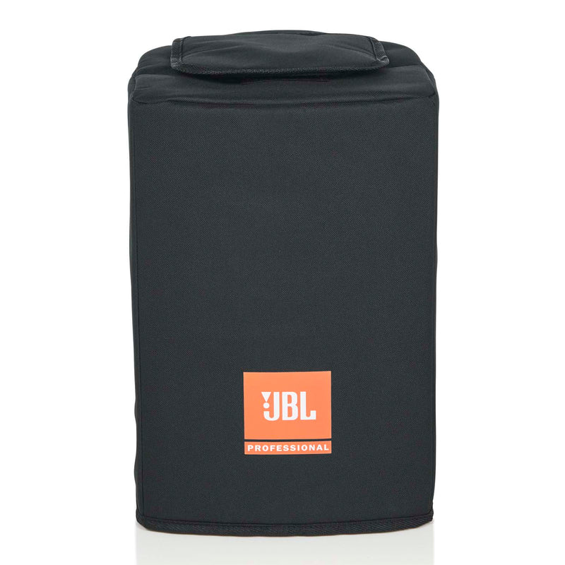 The JBL EONONECOMPACT-CVR Standard Cover for EON ONE Compact Portable Speaker System - Black is a tough, water-resistant speaker cover made with a 600D polyester exterior fabric and a soft 210D polyester interior fabric with 5mm of foam padding for extra protection. A top handle cutout provides access to the built-in handles and includes a touch-fastener closure. The cover sports a JBL Professional logo on the front.