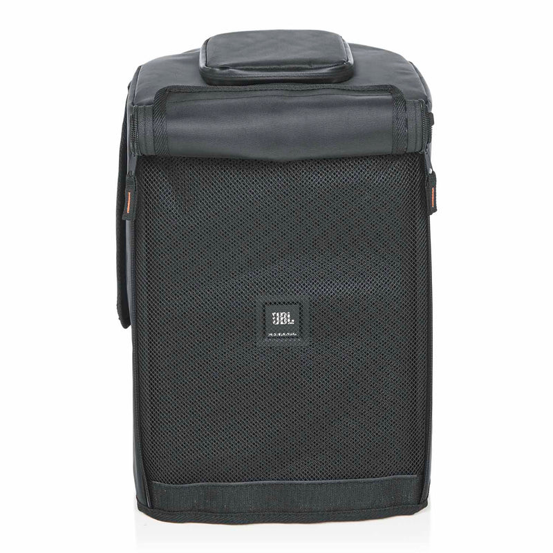 A top handle cutout allows you to deploy the speaker in less-than-ideal conditions, while and two side panel cutouts provide access to the built-in handles and feature touch-fastener closures. The front cover rolls up to expose a mesh speaker grille and zippers down when not in use. The cover sports a JBL Professional logo on the front.