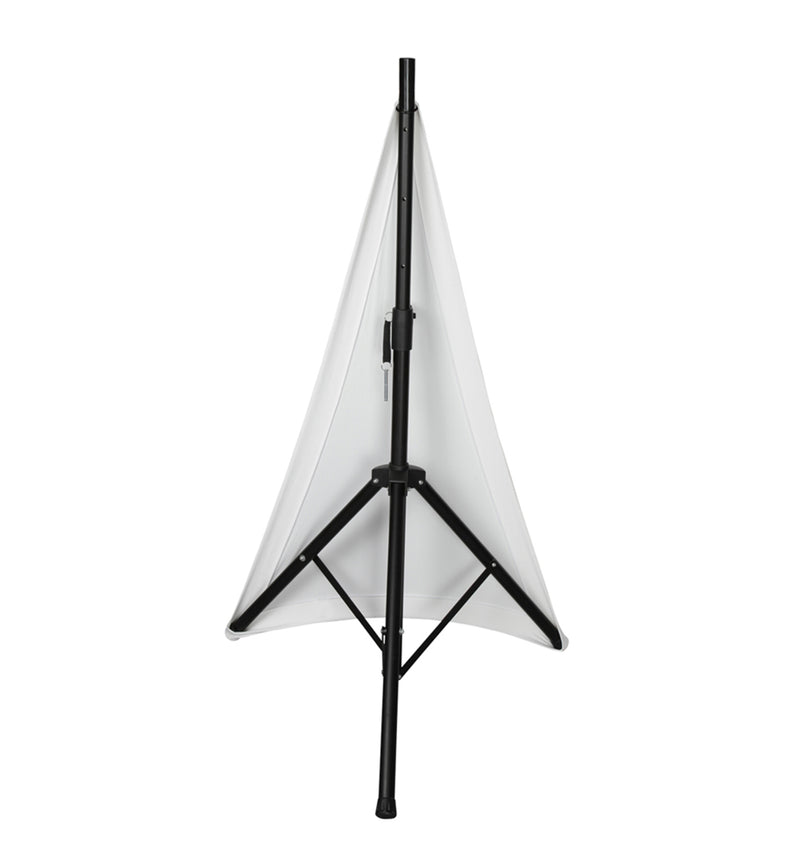 The JBL STAND-STRETCH-COVER-WH-1 Stretchy White Tripod Stand Cover - 1 Side presents a clean appearance for your DJ, corporate, or worship applications. It is made from a stretchy Lycra and spandex blended fabric to conform to the shape of your tripod. First, you secure it to the tripod legs using the sewn-in foot pockets and then attach it to the top via a touch-fastener strap that wraps through a D-ring. It is machine washable, and includes a reusable storage pouch.