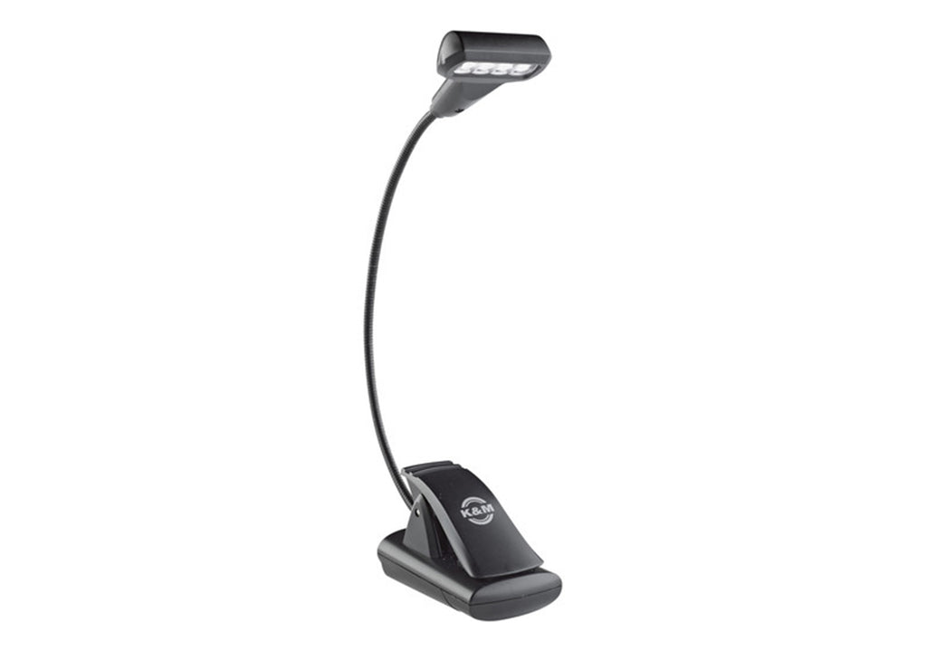 The K&M 12272 4-LED T-Model FlexLight is a versatile and compact lighting solution for music stands, desks, keyboard stands, or shelves. Featuring a flexible gooseneck and wide clip, it can be easily positioned and securely mounted. The lamp provides warm white light with two brightness levels, powered by four durable LEDs rated for 100,000 hours. It offers up to 10 hours of operation with the included AAA batteries and can also be powered via an optional AC adapter.