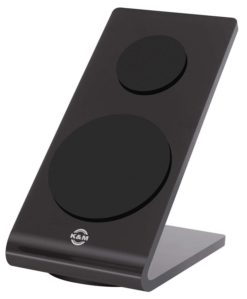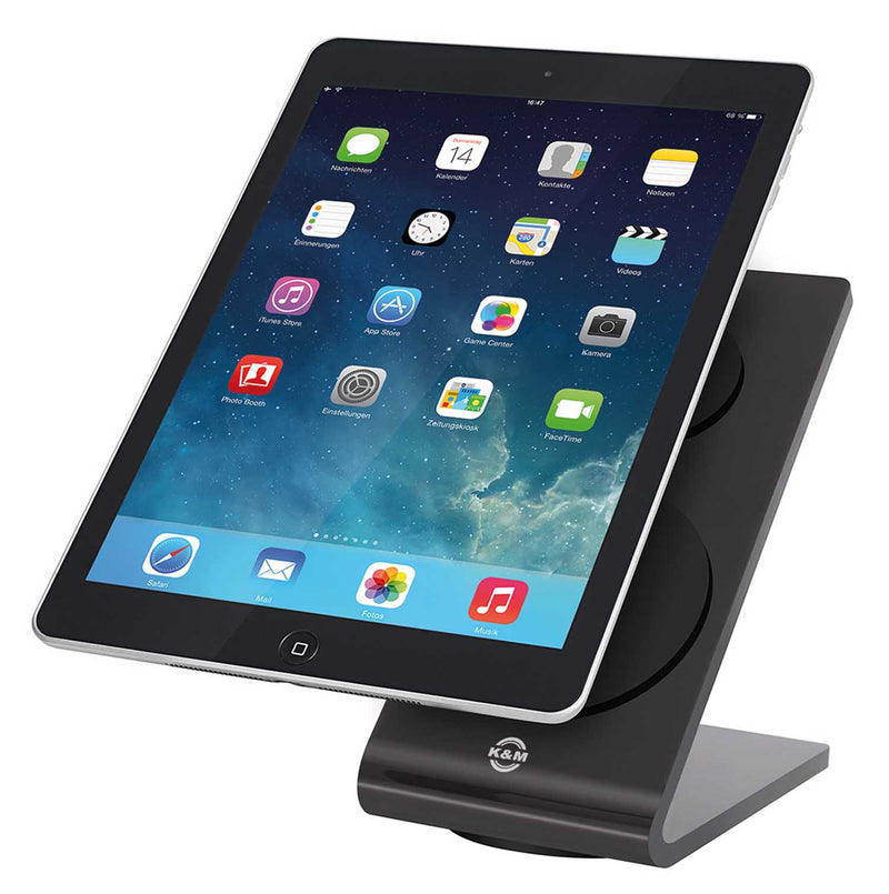 The K&M 19855 Tablet PC Stand - Black made out of high sheen, deep black acrylic glass, your tablet has a prominent spot on your desk. Two grip pads hold the tablet in place (without adhesives and magnets), you can choose between vertical and horizontal placement. The tablet is easy to place into and remove from the stand. To reactivate the grip pads simply clean them with water. The 45° angle provides for the viewing of videos and photos and for surfing and typing. The stand is equipped with two non-slip pads on the bottom of the stand.