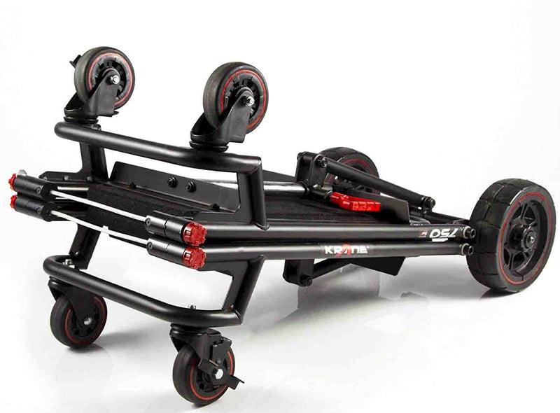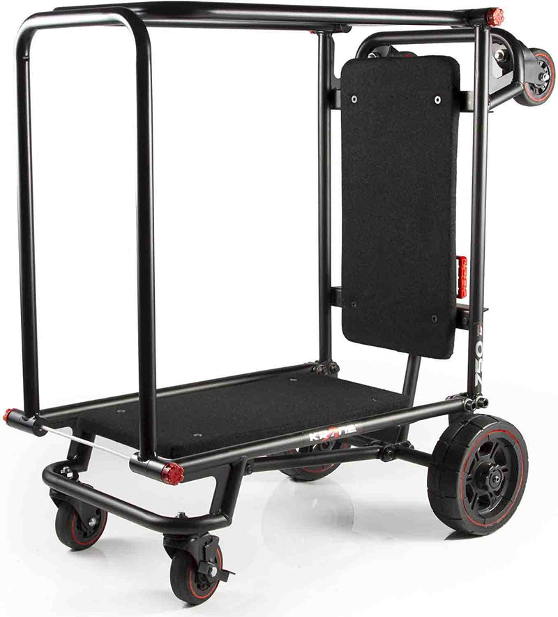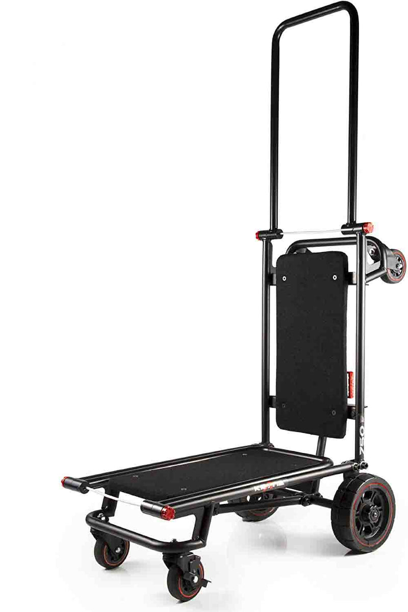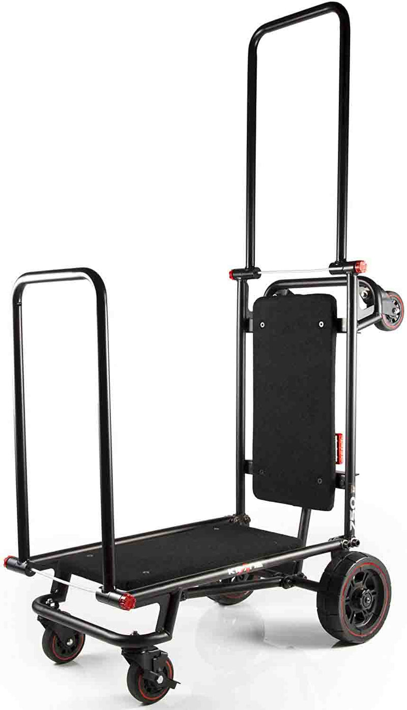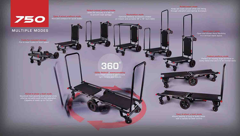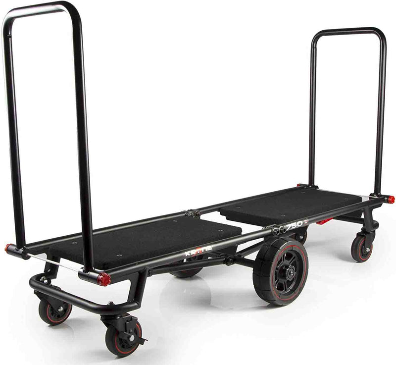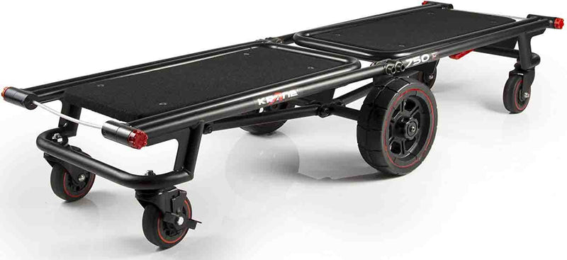 The Krane AMG 750 Heavy Duty Equipment Cart is designed for DJ's and Sound Reinforcement companies that move speakers, lighting, and other heavy cases. It makes loading in gear a breeze without breaking your back. This foldable cart is a compact but heavy-duty smart hauler, the AMG 750 quickly transforms from its folded mode into a 4-wheeler cart that can be pushed or pulled. It's also a super-maneuverable tower cart, and also a longbed "u-boat" cart that boasts a ZERO RADIUS turn capability, thanks to its large never-flat center wheels supporting the load. Comes complete with built-in anti-slip carpeted decks so your stuff securely stays on board - Up to 750 lbs of it.