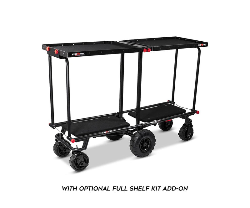 The Krane AMG750-AT Heavy Equipment Hauler is an ALL-TERRAIN Multi-Mode Folding Longbed Cart with 750 lb Capacity. Designed for Pro Audio and DJ Professionals with heavy loads... It's a compact but heavy-duty smart hauler. The AMG 750 quickly transforms from its folded mode into a 4-wheeler cart that can be pushed or pulled, a super-maneuverable tower cart, and into a longbed "u-boat" cart that boasts a ZERO RADIUS turn capability, thanks to its large never-flat center wheels supporting the load. Comes complete with built-in anti-slip carpeted decks so your stuff securely stays on board - Up to 750 lbs of it.