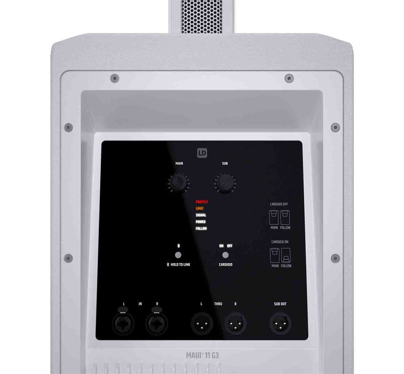 The LD System MAUI 11 G3 W, Portable Cardioid Powered Column PA System - White represents this all-in-one concept in every detail and offers an unrivalled PA package in terms of sound, design, technology and handling. Set it up, plug it in, and you're all set! The MAUI 11 G3 W delivers a huge, powerful and precise sound featuring 730 W RMS power (1,460 W peak), suitable for all applications: as a main PA for concerts, a sound system for mobile DJs or a public address system at weddings, corporate events and many more.