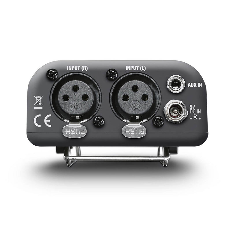 A 3.5 mm stereo jack is provided as an earphone and headphone output. Volume level and balance can be set with easy-grip knobs, a push-button switches between the summed mono and stereo signals. A full-fledged limiter is integrated for distortion-free playback and as protection against feedback.