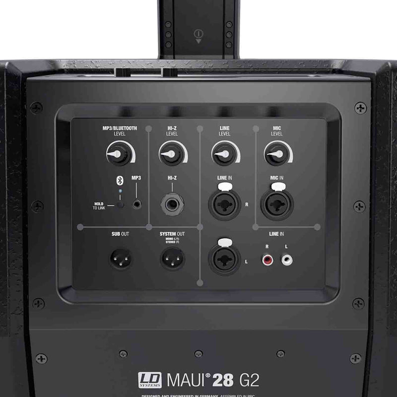The LD Systems MAUI 28 G2 A complete sound system that you can carry together with your instrument: introducing the MAUI 28 G2. The two column elements in the padded shoulder bag, the subwoofer in one hand and the guitar or keyboard in the other - and off you go! Setting up the complete system, which doubles as PA and monitor system is just as easy thanks to the special multi-pin cable plugs. The compact and elegant MAUI 28 G2 offers an unbeatable sound quality and wide-ranging sound distribution. It was developed with year-long experience in the design of the column systems as a user-friendly solution for medium sized gigs and fixed installations.