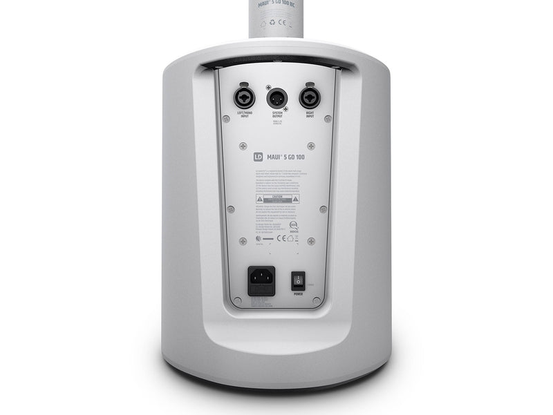 The LD Systems MAUI 5 GO 100 is the ultimate system to deliver crystal-clear, powerful sound in any location. The ultra-portable battery-powered column-PA is supplied by a high-performance lithium-ion unit that provides power to 12 hours operating time. The charger is built into the subwoofer. An external charging dock is available as an accessory. Inputs for microphone, instrument and line signals as well as Bluetooth stereo streaming make the MAUI 5 GO 100 the ideal ideal system for street musicians or for music and speech reproduction at private and business events and all mains power-free applications.
