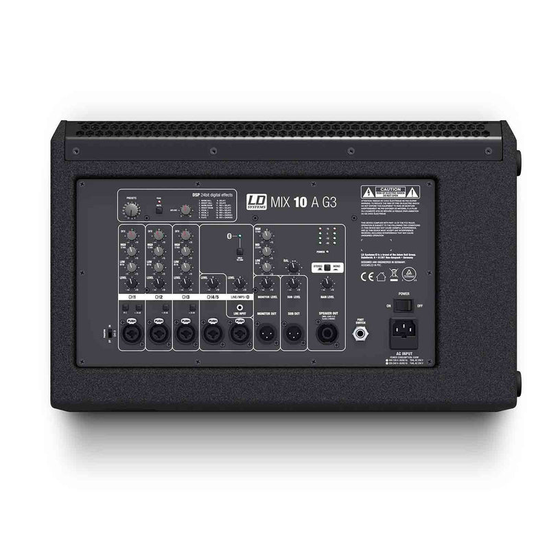 Accommodating a wide variety of input sources including electric instruments, smartphones, tablets, MP3, and CD players, the built-in mixer provides 3 microphone channels with 2-band EQ, 48 V phantom power plus switchable hi-Z input (CH1), and stereo line channel. The output section includes a 3-band master EQ for overall tone shaping, 4-segment LED metering, and XLR monitor and subwoofer outputs. In addition, the LD MIX 10 A G3 sports a DSP with 16 effects presets, limiter and overcurrent, overload, short circuit and thermal protection. A speak ON output allows powering the passive LD MIX 10 G3 to easily create a stereo setup.